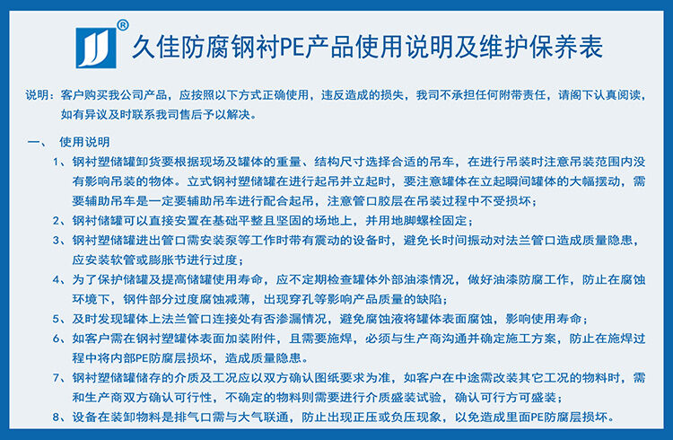 氫氟酸儲(chǔ)罐材質(zhì)  廣東鋼襯PE氫氟酸儲(chǔ)罐廠家 久佳牌 訂制 鋼襯塑酸堿儲(chǔ)存罐特性:鋼襯塑儲(chǔ)罐由于其獨(dú)特的滾塑工藝、產(chǎn)品整體結(jié)構(gòu)和材料優(yōu)異性能,具有整體性好、強(qiáng)度高、無(wú)焊縫、不滲漏、抗沖擊、韌性好、重量輕、壽命長(zhǎng)、耐酸堿、耐有機(jī)溶媒、符合衛(wèi)生標(biāo)準(zhǔn)、價(jià)格低廉、規(guī)格品種多等特點(diǎn)。尤其耐腐蝕、長(zhǎng)壽命和大規(guī)格品種有非常大的優(yōu)勢(shì),是貯存和運(yùn)輸各類化工液體半固體的理想產(chǎn)品。其性能大大超過(guò)了傳統(tǒng)的玻璃鋼、陶瓷、橡膠、焊接塑料等材料制作的防腐儲(chǔ)罐。已成為傳統(tǒng)防腐儲(chǔ)罐的升級(jí)換代產(chǎn)品,逐漸成為防腐儲(chǔ)罐的首選產(chǎn)品。