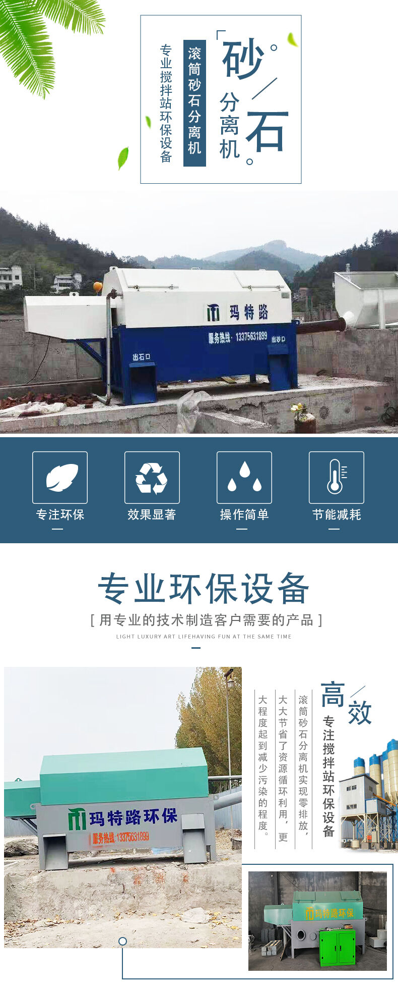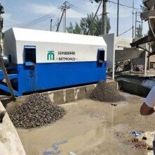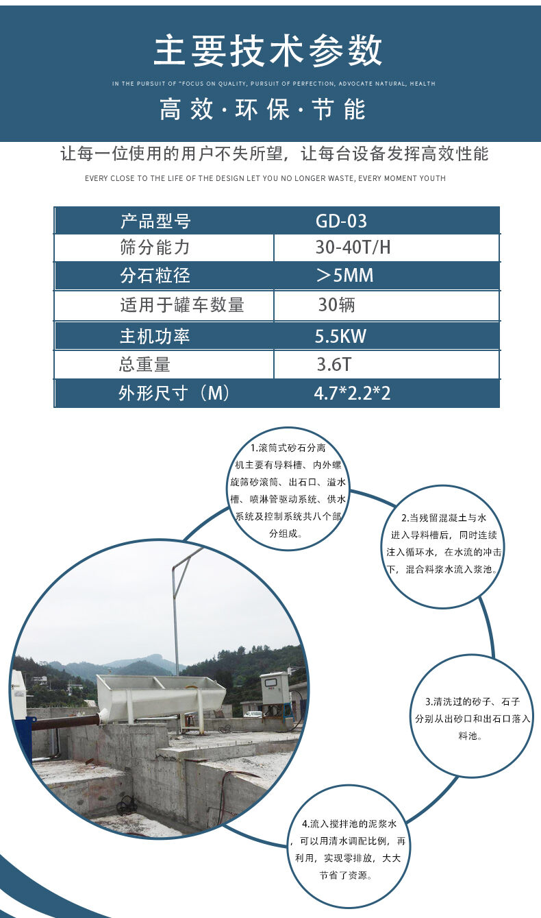 滾筒式砂石分離機主要有導(dǎo)料流槽、內(nèi)外螺旋篩砂滾筒、出石口、溢水槽、噴淋管、驅(qū)動系統(tǒng)、供水系統(tǒng)及控制系統(tǒng)共八個部分組成。當(dāng)殘留混凝土與水進(jìn)入導(dǎo)料槽后,同時連續(xù)注入循環(huán)水,在水流的沖擊下,混合料漿水流入漿池。清洗過的砂子、石子分別從出砂口和出石口落入料池。流入攪拌池