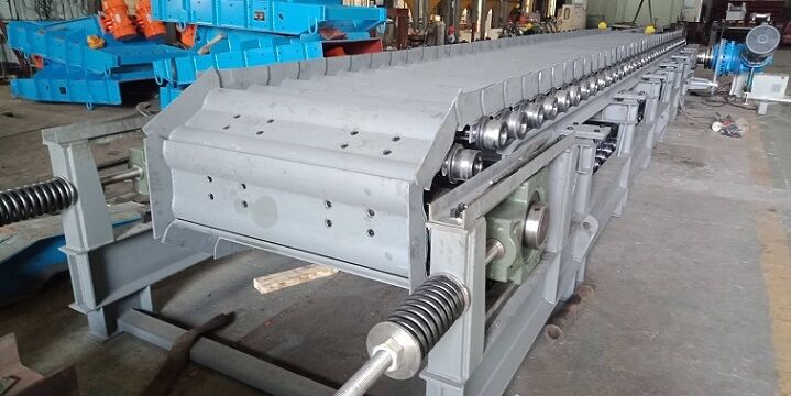 包括機(jī)架、頭罩、主軸、尾軸、鏈條、槽板、傳動(dòng)系統(tǒng)、料倉(cāng)、均料器、集水盤和清掃器,