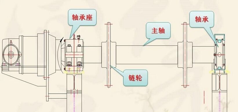 該裝置主要由軸、鏈輪、支承輥等件組成。兩端支撐為滾動軸承,主軸與減速器、空心軸套裝在一起,通過鎖緊盤將其二者連接到一起,達到傳遞扭矩的要求,結構緊湊。