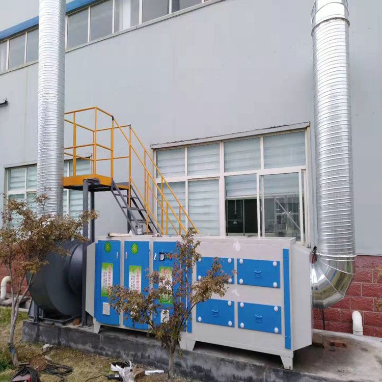 惡臭氣體利用排風設備輸入到UV光解凈化設備后,凈化設備利用特制的高能高臭氧UV紫外線光束照射惡臭氣體和TiO2光催化,催化裂解惡臭氣體,進行協(xié)同分解氧化反應,使惡臭氣體物質(zhì)其降解化成低分子化合物、水和二氧化碳,再通過排風管道排出室外。
