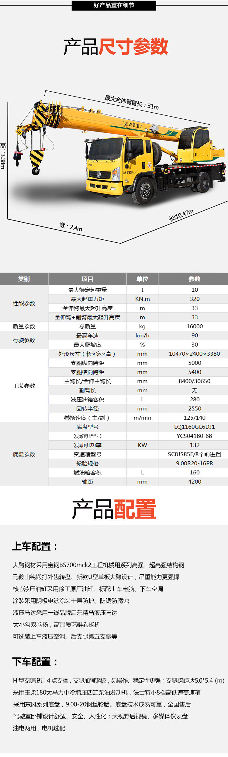 1、新型單板臂頭設計,全伸臂31米,最大吊高33米