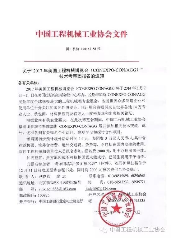 根據(jù)業(yè)內(nèi)有關(guān)企業(yè)要求,在此次博覽會(huì)期間,中國(guó)工程機(jī)械工業(yè)協(xié)會(huì)擬組團(tuán)參觀拉斯維加斯CONEXPO-CON/AGG展并參加相關(guān)技術(shù)交流,此外,還準(zhǔn)備到有關(guān)知名企業(yè)訪問(wèn)、參觀學(xué)習(xí)和探討合作項(xiàng)目。