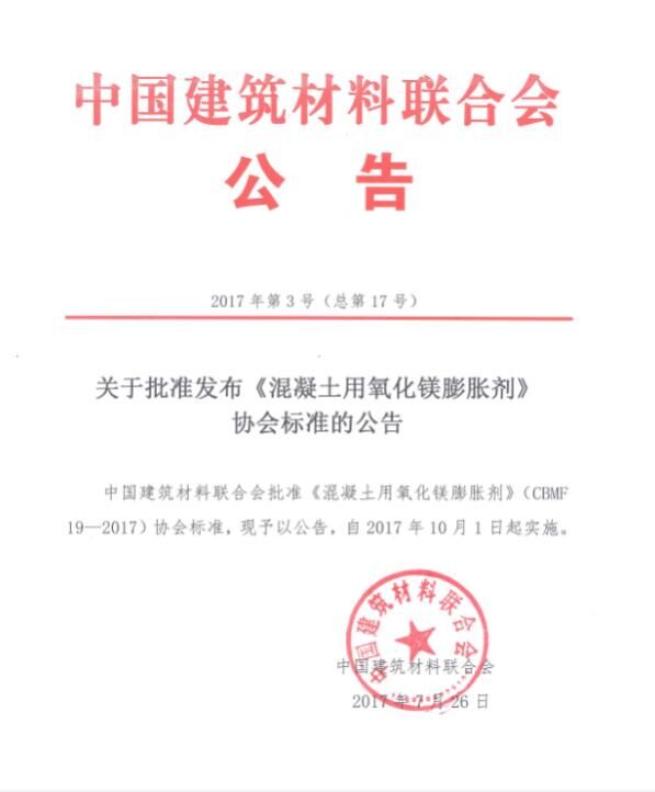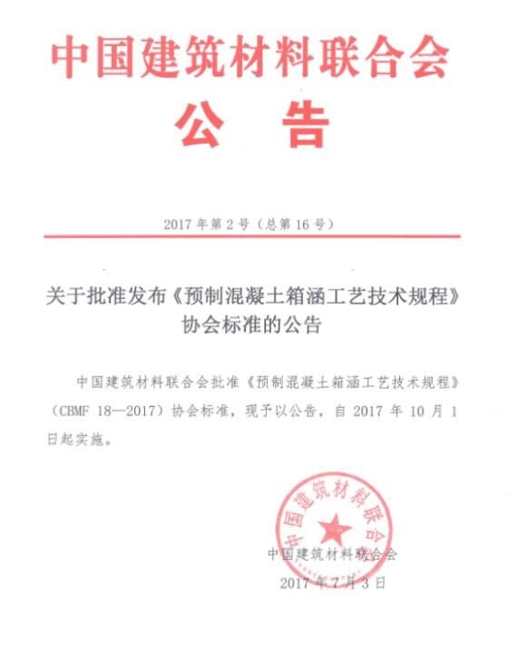 2017年7月,由中國(guó)混凝土與水泥制品協(xié)會(huì)(以下簡(jiǎn)稱協(xié)會(huì))組織制定的《預(yù)制混凝土箱涵工藝技術(shù)規(guī)程》和《混凝土用氧化鎂膨脹劑》兩項(xiàng)協(xié)會(huì)標(biāo)準(zhǔn),通過(guò)審定并發(fā)布批準(zhǔn)公告,標(biāo)準(zhǔn)號(hào)分別為CBMF 18-2017和CBMF 19-2017,將同時(shí)于2017年10月1日起實(shí)施。這是國(guó)務(wù)院《深化標(biāo)準(zhǔn)化工作改革方案》(國(guó)發(fā)[2015]13號(hào))及質(zhì)檢總局、國(guó)家標(biāo)準(zhǔn)委《關(guān)于培育和發(fā)展團(tuán)體標(biāo)準(zhǔn)的指導(dǎo)意見(jiàn)》(國(guó)質(zhì)檢標(biāo)聯(lián)[2016]109號(hào))發(fā)布后,協(xié)會(huì)與中國(guó)建筑材料聯(lián)合會(huì)(以下簡(jiǎn)稱聯(lián)合會(huì))聯(lián)合發(fā)布的首批協(xié)會(huì)標(biāo)準(zhǔn),兩項(xiàng)標(biāo)準(zhǔn)將公開(kāi)出版并發(fā)行。