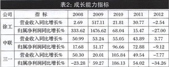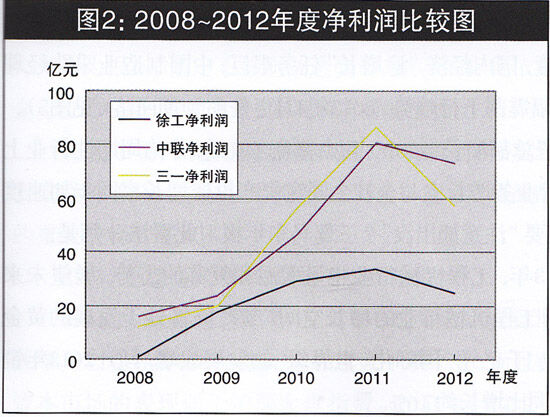 公司的成長與盈利能力正相關。在年報中,主營業(yè)務收入增長率、凈利潤增長率、凈資產增長率以及凈資產收益率、毛利率、凈利率等財務指標,是判斷企業(yè)成長性和盈利能力的重要指標。表2顯示,三駕馬車中,5年主營業(yè)務收入同比增長率實現連續(xù)5年正增長、連續(xù)三年保持30%以上增長率的公司是中聯,五年中增長率振幅最大的公司是徐工,2012年徐工和三—主營業(yè)務收入增長率均出現負增長;表2還顯示,凈利潤同比增長率方面,沒有—家公司連續(xù)五年正增長,2012年三駕馬車同時出現負增長,三一錄得-34.26%的最大降幅。在大環(huán)境不利因素作用下,公司成長性受到嚴峻挑戰(zhàn)(見圖2)。