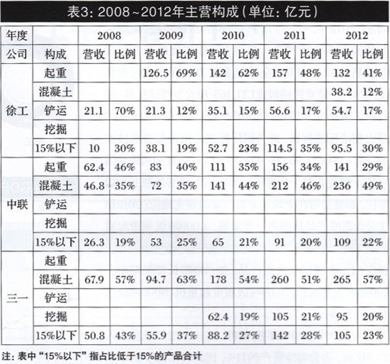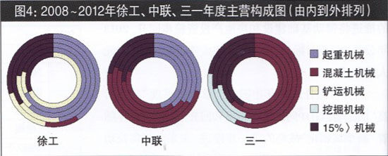 圖4 2008~2012年徐工、中聯、三一年度主營構成圖