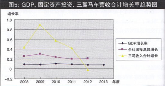 周期性行業(yè)受周期制約的特點,決定周期性行業(yè)要避免誤判宏觀經濟發(fā)展趨勢,才能健康發(fā)展。5年來,三駕馬車—直在擴張產能,在經濟下行壓力加大、GDP增長率持續(xù)回落的宏觀背景下,主要財務指標必然加速度回落(見圖4)。面對如此局面,要保持增長勢頭,就必須準確判斷宏觀經濟趨勢,調整企業(yè)發(fā)展戰(zhàn)略。三駕馬車,是如何判斷宏觀經濟發(fā)展趨勢的呢?