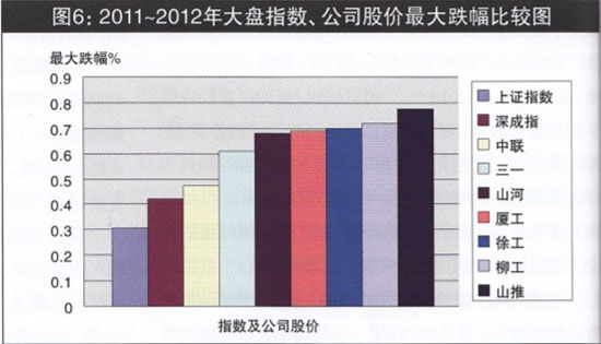 2011年,行業(yè)遭遇寒冬,三駕馬車營業(yè)收入合計增三率與宏觀經濟指標對比,呈加速度下跌態(tài)勢,而且在資本市場的表現弱于滬深大盤指數。2011年~2012年間,其股價從最高點至最低點,下跌47.3%、61.2%、69.8%不等;而同期上證指數下跌幅度只有30.67%,深成指下跌42.1%。盡管與行業(yè)內其他上市公司同期資本市場表現相比,工程機械行業(yè)三駕馬車的表現仍有亮點,但其同期跌幅大于上證和深成指跌幅,仍然令公司形象受損,影響資本市場再融資能力。因此,打造公司核心競爭力,提升公司投資價值,提振資本市場投資者信心,至關重要(大盤指數、公司股價最大跌幅比較圖,見圖6)。