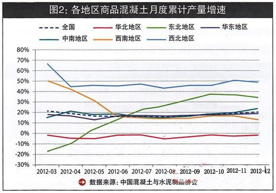 2012年前三季度,房地產調控和重點在建續(xù)建大型工程項目啟動緩慢,商品混凝土市場需求大幅下降,前三季度累計同比增長7.9%,到了第四季度增幅有所回升,最終全年增速在11%。