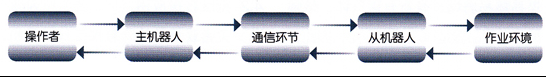 工程機(jī)器人研究的現(xiàn)狀表明,由于受到機(jī)構(gòu)、控制、傳感器以及人工智能水平的限制,研究出能在未知環(huán)境中全自主方式工作的機(jī)器人是目前難以實現(xiàn)的目標(biāo)。因此,目前在核工業(yè)、搶險救災(zāi)等高危、惡劣的環(huán)境中被廣泛應(yīng)用的是遙操作機(jī)器人。遙操作機(jī)器人主要分為視覺臨場感遙操作機(jī)器人、力覺臨場感遙操作機(jī)器人、觸覺臨場感遙操作機(jī)器人及運動覺臨場感遙操作機(jī)器人等。基于臨場感的遙操作機(jī)器人系統(tǒng)原理如圖3所示,它由操作者、主機(jī)器人(手控器)、通訊環(huán)節(jié)、從機(jī)器人和作業(yè)環(huán)境5部分構(gòu)成。在臨場感系統(tǒng)工作過程中,由操作者向主機(jī)器人發(fā)出操作命令(如位置指令)操作主機(jī)器人運動,主機(jī)器人的運動信息通過通訊環(huán)節(jié)傳給遠(yuǎn)方的從機(jī)器人,從而控制從機(jī)器人的運動;當(dāng)從機(jī)器人同環(huán)境交互時,從機(jī)器人的運動信息(如視覺、力覺、觸覺等信息)又通過通訊環(huán)節(jié)反饋給本地主機(jī)器人,使操作者對于現(xiàn)場作業(yè)情況有了有效的感知,從而能夠及時做出準(zhǔn)確判斷,發(fā)出相應(yīng)的操作命令,控制遠(yuǎn)方從機(jī)器人準(zhǔn)確、高效地完成作業(yè)任務(wù)。目前,基于視覺臨場感的工程機(jī)器人遙操作控制主要是用攝像機(jī)獲取現(xiàn)場的視頻圖像并回傳到主控端,操縱者通過監(jiān)視器來完成對工程機(jī)器人的操作任務(wù)。