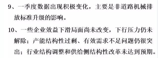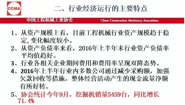 我個人總結,今年的運行情況有這樣十個方面。第一,從整個全行業(yè)各企業(yè)的資產(chǎn)規(guī)模上看,目前趨于穩(wěn)定,變化幅度很小,不像前兩年振動那么大。第二,從資產(chǎn)負債率來說,現(xiàn)在負債率是在60%左右,全國的工業(yè)企業(yè)是56%。所以,這個行業(yè)的資產(chǎn)負債率目前看也是很好的。這個需要引起大家的關注和分析,我們也希望后幾個月情況可以穩(wěn)定向好。還有自主品牌市場占有率,在國內市場還是保持高位,從全行業(yè)來看在90%以上。那么,產(chǎn)業(yè)的集中度又進一步地增強了,但有一些企業(yè)挺無助的,出局了,進口額下降。今年按照環(huán)保部5號令,全行業(yè)工程機械產(chǎn)品實現(xiàn)了新的標準升級。整個產(chǎn)品進行了更新?lián)Q代,這個非常難能可貴。最后是產(chǎn)能結構性過剩,有效需求不足問題仍然突出,行業(yè)結構調整還有供給側結構改革遠遠沒有達到預期。即便是按照現(xiàn)在的挖掘機銷量5500多臺,就算是6000臺,產(chǎn)能又有多少?一旦市場回暖,一些企業(yè)家還是會頭腦一熱,這樣大一個產(chǎn)能釋放出來的產(chǎn)量是什么局面?我們必須保持一個清醒的頭腦。